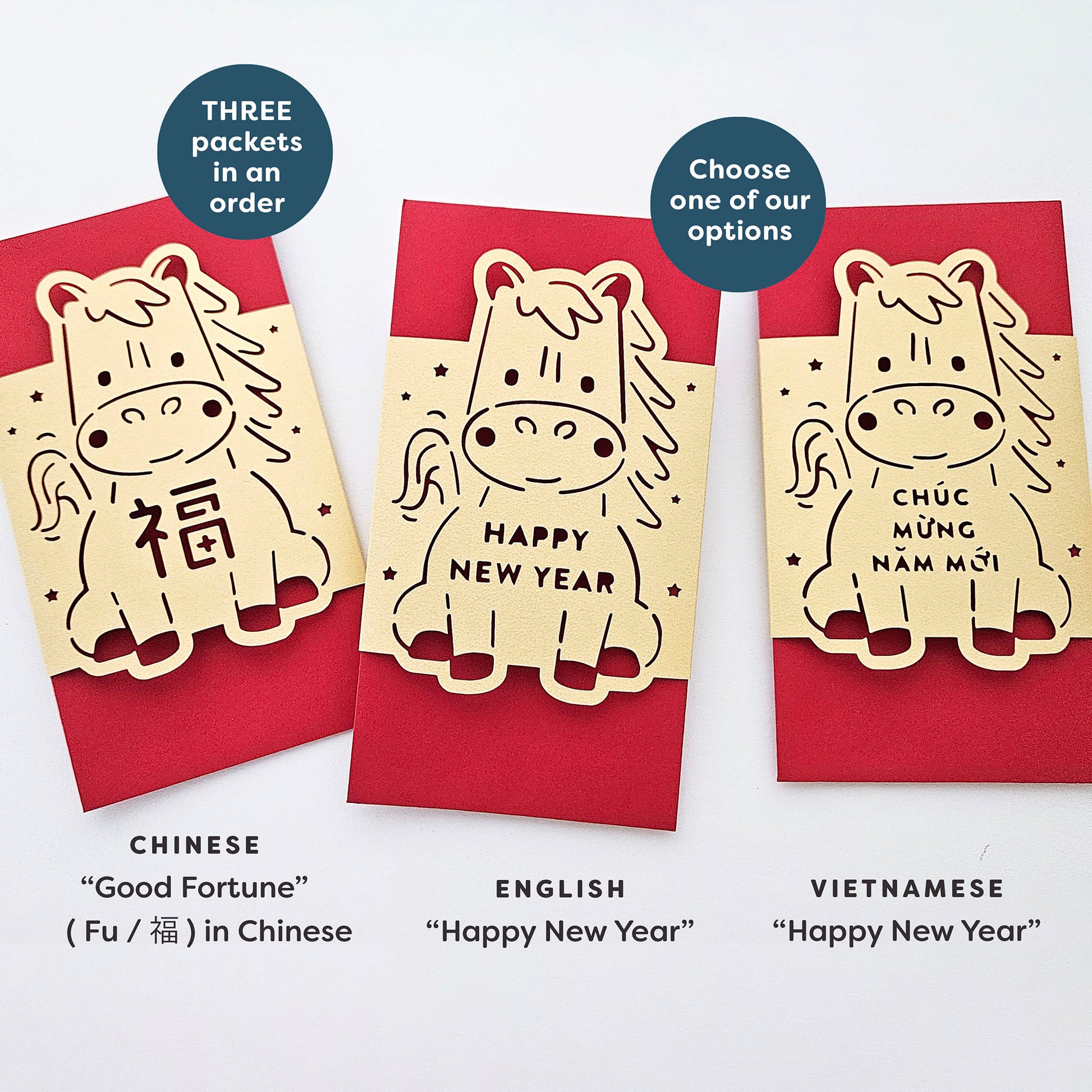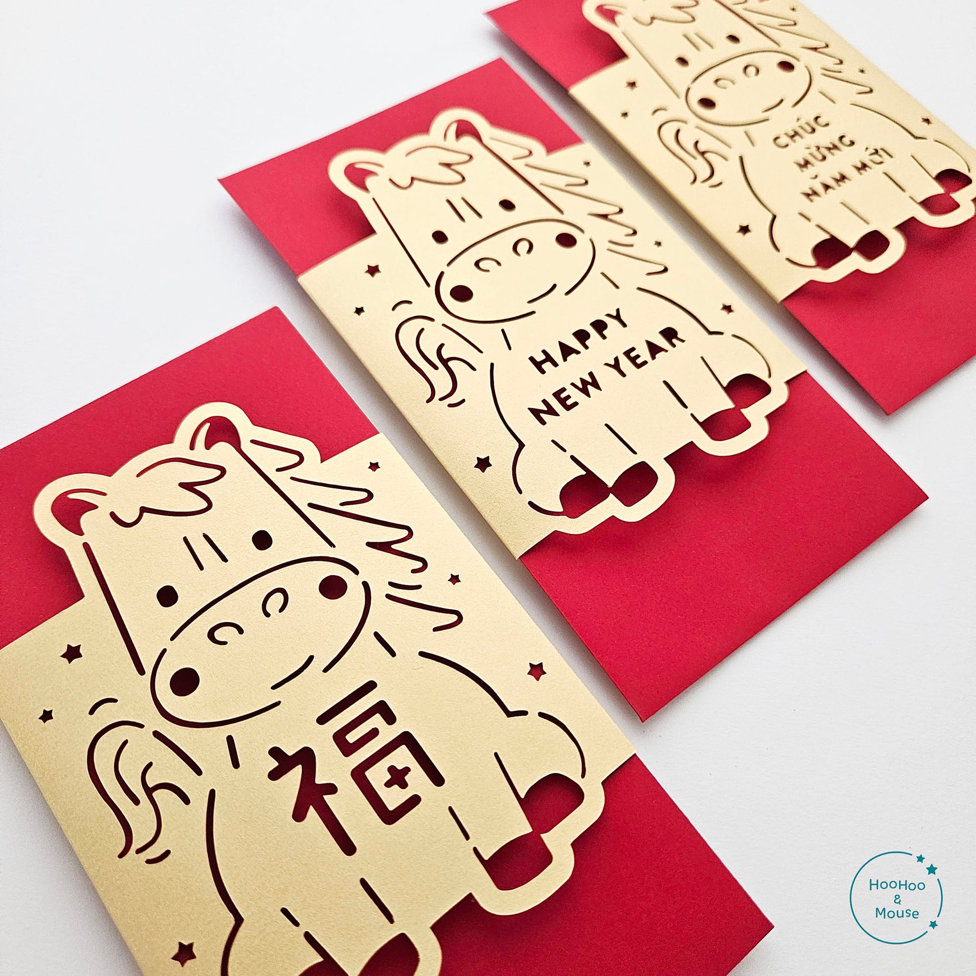 Celebrate the Asian red envelope tradition in style with our "Happy New Year" Horse money packets. Handcrafted and paper cut, these envelopes feature an adorable horse design with "Happy New Year" in English, Chinese, and Vietnamese. Select the lucky cards in your preferred language. They're perfect for gifting money and other tokens of luck.