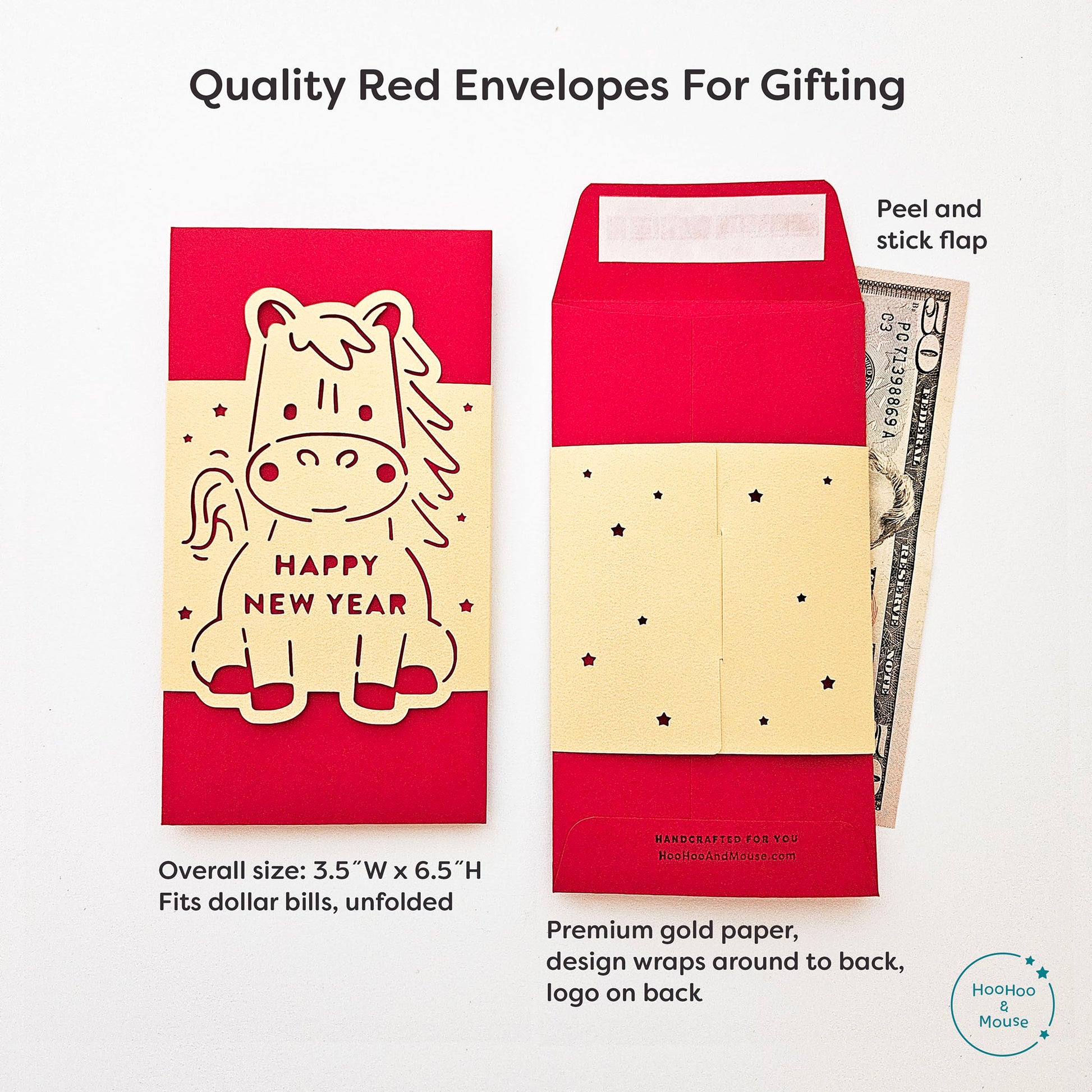 Our lucky money packets make memorable gifts for friends and loved ones this 2026 Year of the Horse. An order includes a variety of 6 radiant designs that encompass the spirit of the Lunar New Year. Each red envelope is wrapped with a thick gold sleeve with paper cutouts, allowing the lucky red to shine through. Give the gift of unique, handmade envelopes this Horse year!